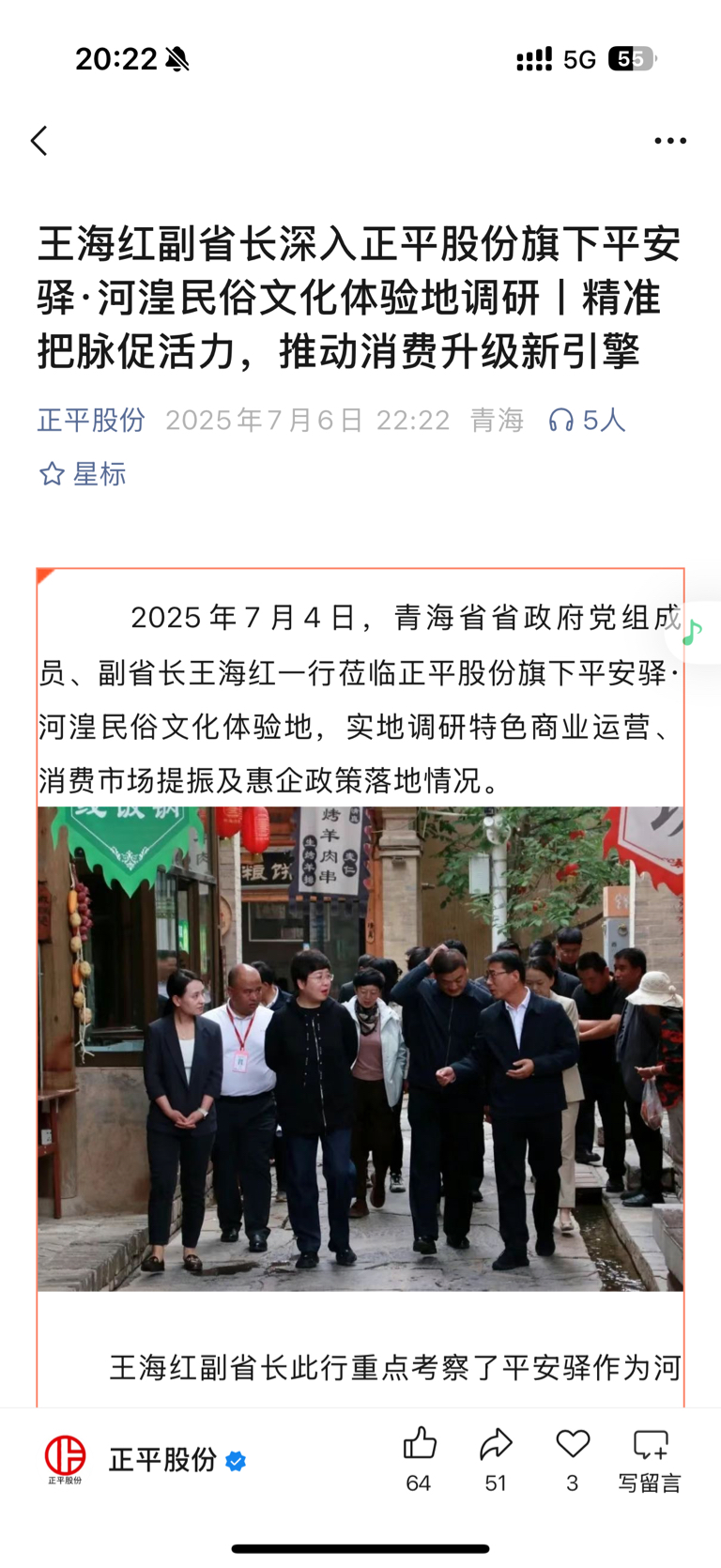 五、 今年3月青海省书记到正平(图4)、省长到正平(图4)、6月副省长到正平(图5)、7月副省长到正平(6),你见过哪一支票有连续省书记、省长、副省长先后到访的?所以全市场找不出第二支比正平逻辑更硬的票了。还是那句话,唱空人的后代退世了、正平也不会退市。