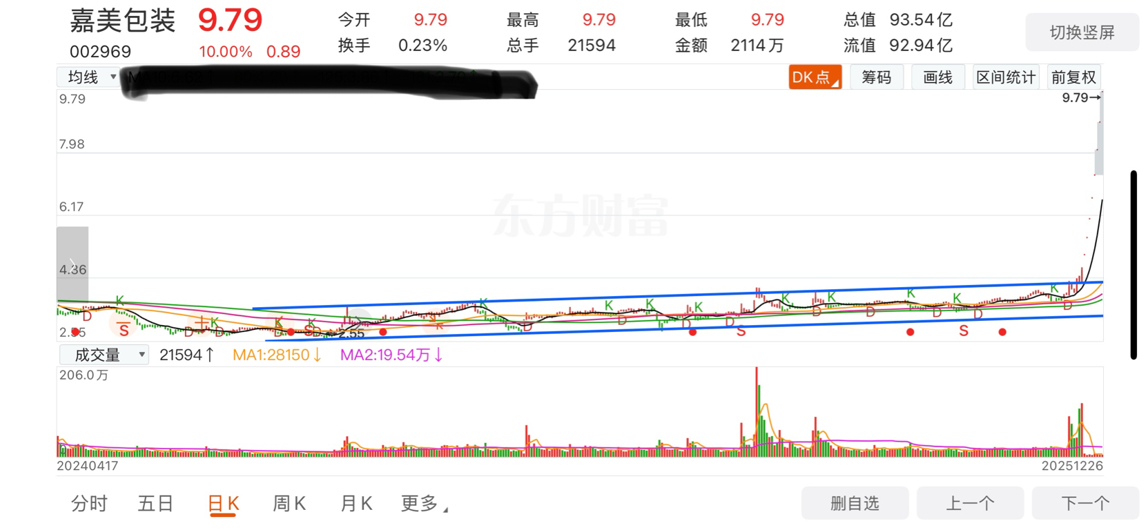 2025年最后三个交日,就是嘉美包装和胜通能源之间妖王PK了,从价格上比,嘉美更有性价比,期待嘉美包袋打出价格新高度,有8就有10的趋势能否完美突破。
