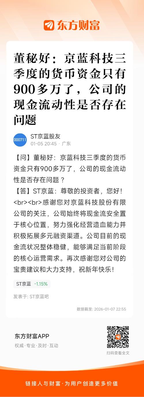 董秘好:京蓝科技三季度的货币资金只有900多万了,公司的现金流动性是否存在问题 ?
