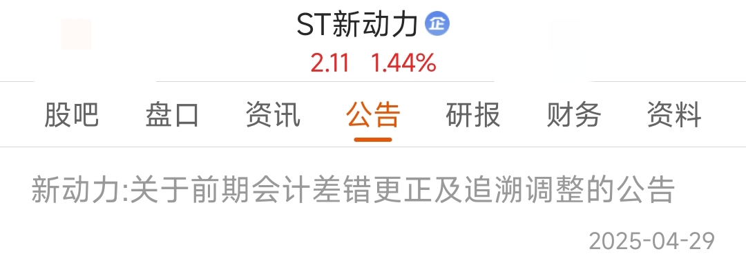 此外,ST新动力虽然提示加星风险,但是2025年4月29日披露会计差错更正公告,已经消除内控缺陷。