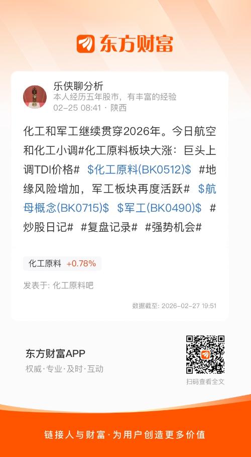 化工和军工继续贯穿2026年。今日航空和化工小调#化工原料板块大涨:巨头上调TDI价格# $化工原料(BK0512)$ #地缘风险增加,军工板块再度活跃# $航母概念(BK0715)$ $军工(BK0490)$ #炒股日记# #复盘记录# #强势机会#