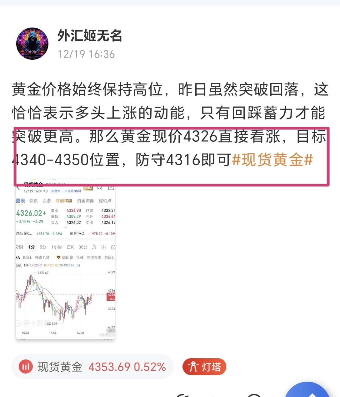 美盘黄金直接上涨来到4350关口,姬无名说了看到此处,走势完美吻合。目标得到24㸃