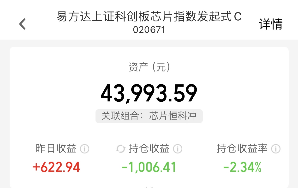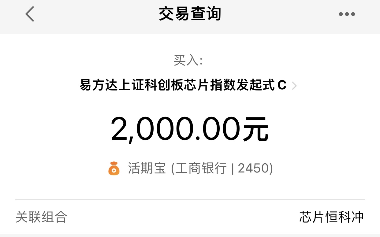今日加仓2000元易方达科创芯片(020671),芯片今天整体调整,高位回调了10%,今天买的这笔是划算的。易方达科创芯片今年涨56.41%,是同类产品中非常优秀的。今天调整是受美股大环境影响,昨天美股暴跌,市场质疑AI泡沫,腾讯资本开支下调,对国内AI应用来说,本质还是缺芯片,所以需求这一块并没有什么变化,主要还是情绪以及资金拥挤度较高,等待场外资金入场及调整充分,行情还会回来的。芯片我还是会加仓,先拿到年底看看。