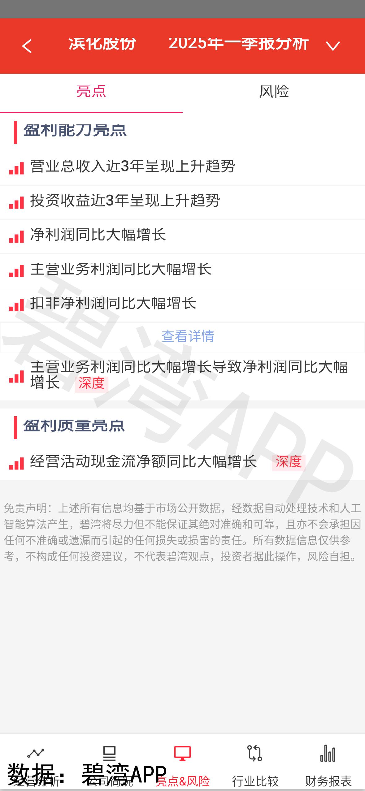 滨化股份2025年一季度业绩显著改善,营业总收入同比增长94.14%,净利润同比大增2.25倍,主要受益于主营业务利润及投资收益的强劲增长。经营活动现金流净额同比激增89.25倍,反映出经营效率提升。但需警惕净利润自2021年以来的整体下滑趋势,虽近期回升,企业利润稳定性仍存隐忧。所得税费用大幅增加可能对未来盈利形成压力,需持续关注其盈利能力的持续性及现金流管理状况。
