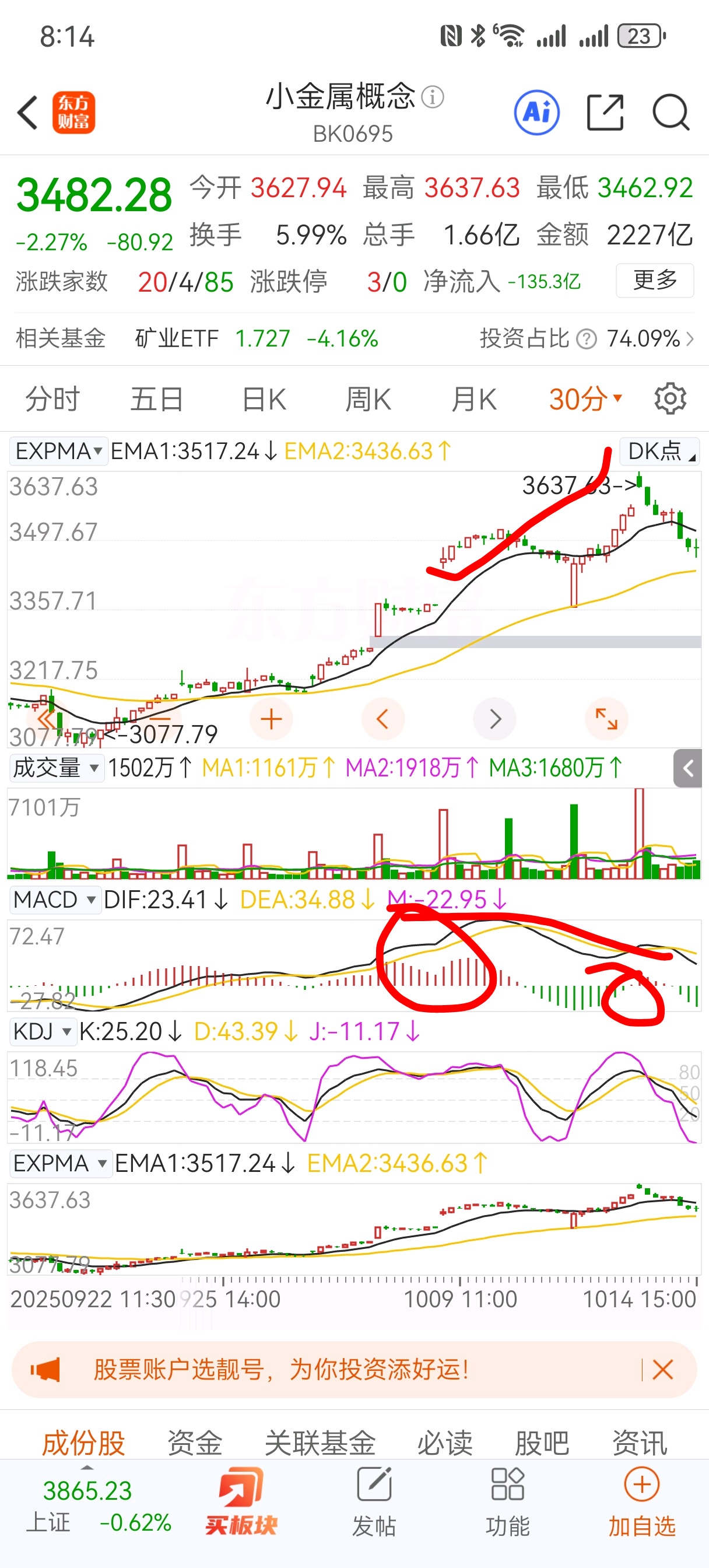 $小金属概念(BK0695)$ 完了,今天小金属和有色都是放巨量滞涨出货形态。并且出现顶背离分时形态。大宗商品明天开始也要开始正式走弱了