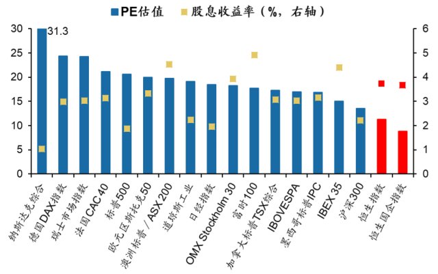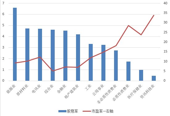 图7:恒生综合行业指数各板块股息率(近12个月)(%)和市盈率PE(TTM)(倍)
