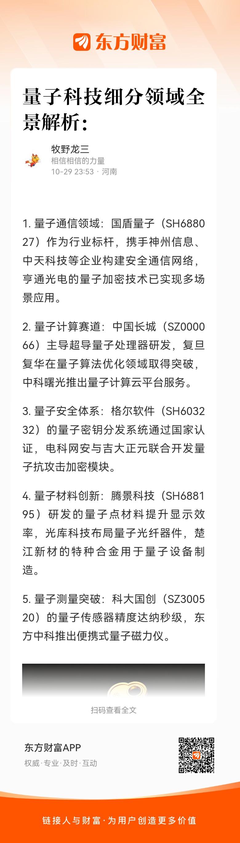 4. 量子材料创新:腾景科技(SH688195)研发的量子点材料提升显示效率,光库科技布局量子光纤器件,楚江新材的特种合金用于量子设备制造。