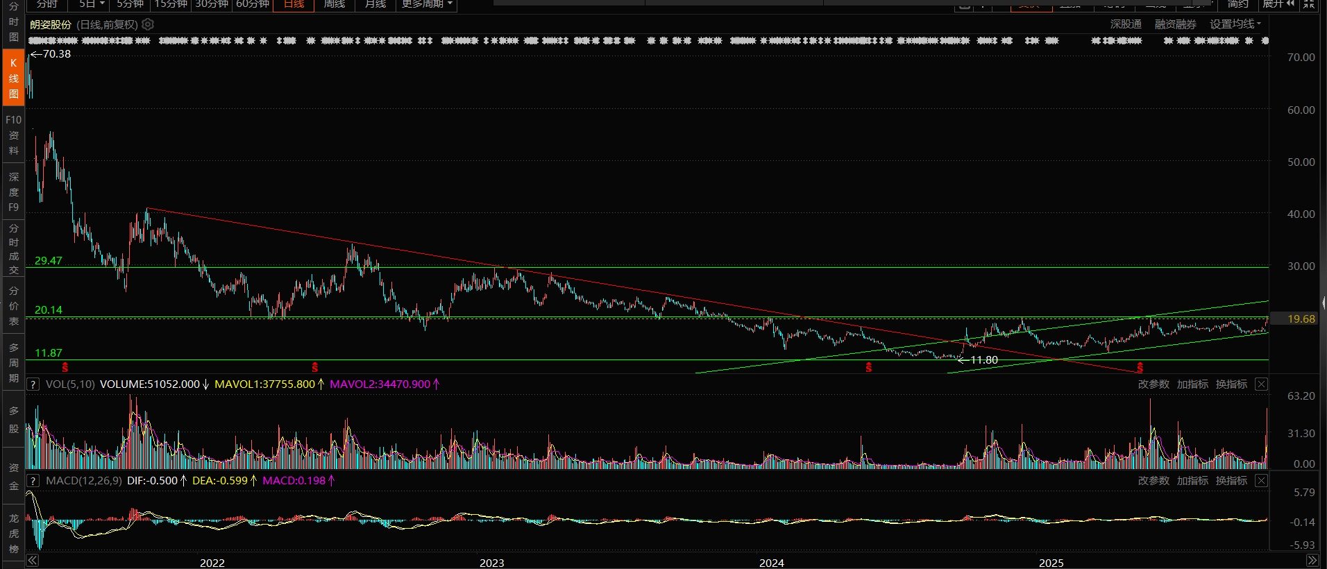 $朗姿股份(SZ002612)$examp趋势线19附近低吸?
