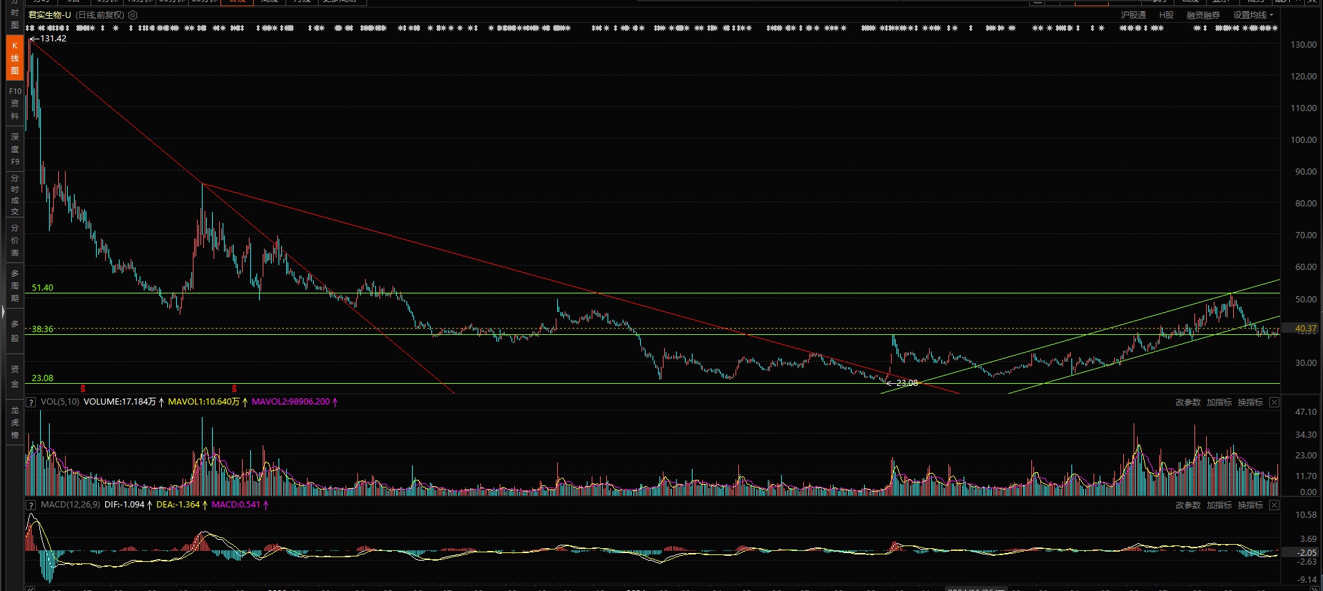 君实生物,不有效跌破38.36,问题就不大。这个地方震荡一下,我认为,还是要继续向上走