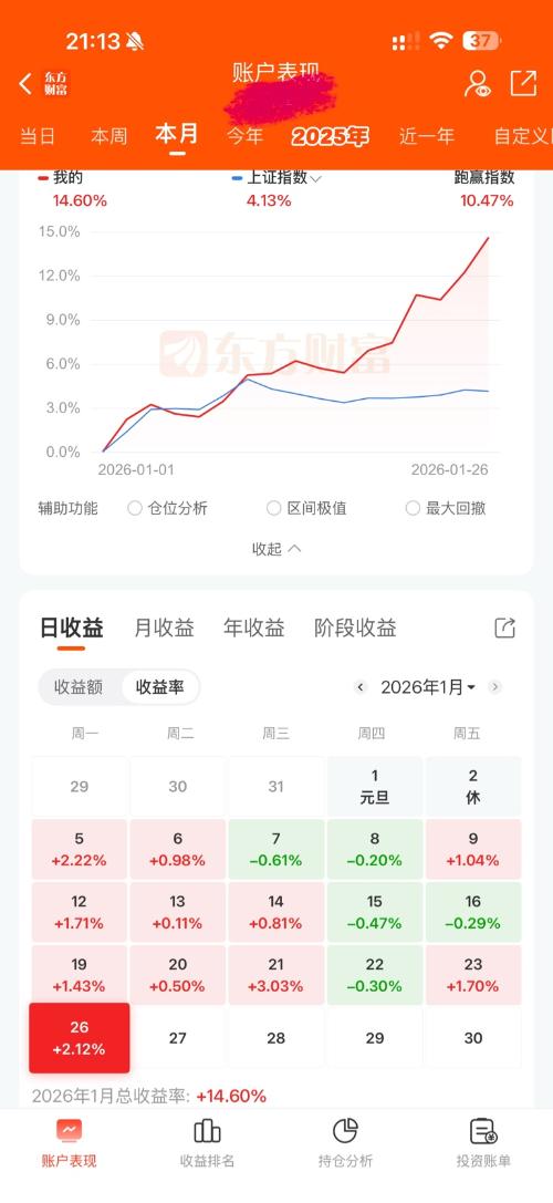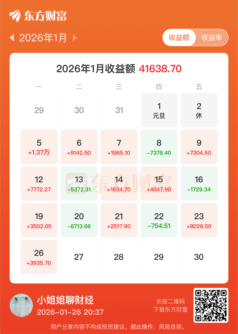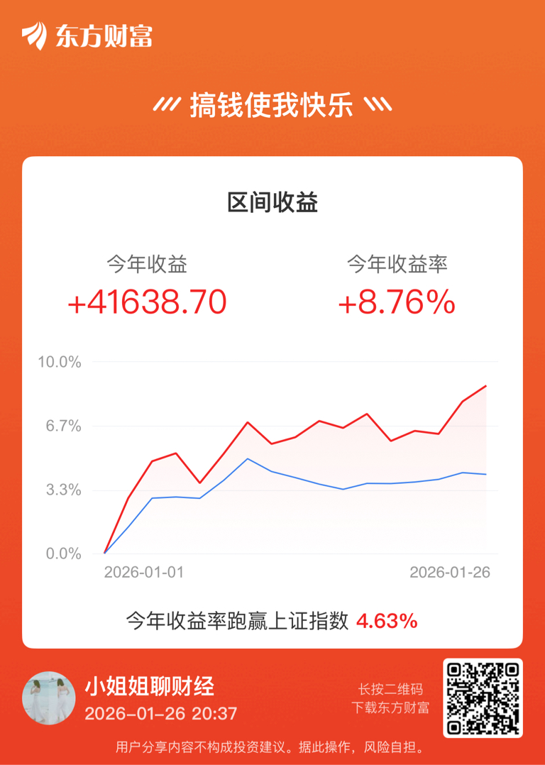 今天重仓的工业有色,黄金股大涨,电网设备涨幅也不错,账户今天盈利3935元,今年的累计收益终于突破41000元,累计收益率去到8.76%,开心。