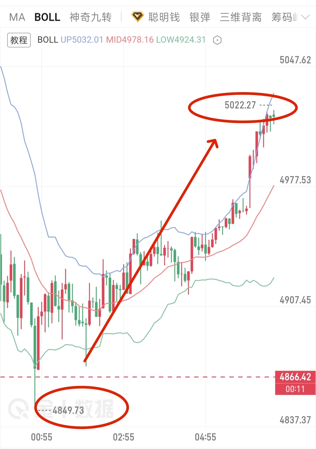 同时给出上行强压,5020-5025区间做箜,最低至4790,大幅击穿4980目标位,超预期完成,拿下233点空间。