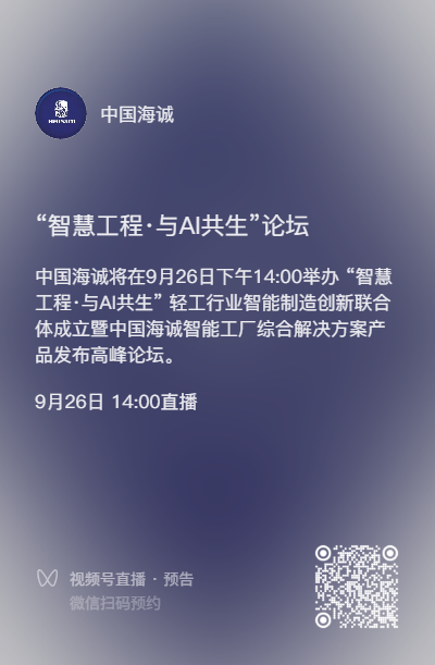 中国海诚将在9月26日下午举办 “智慧工程·与AI共生” 轻工行业智能制造创新联合体成立暨中国海诚智能工厂综合解决方案产品发布高峰论坛。