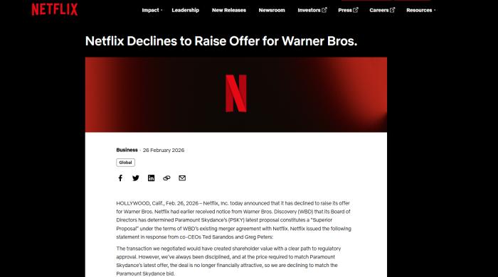 去年12月,Netflix曾以近830亿美元与华纳兄弟探索达成初步收购意向。但派拉蒙随后将收购报价提升至每股31美元,最终迫使华纳兄弟探索董事会认定派拉蒙报价“优于”Netflix。Netflix于26日宣布退出,称匹配报价已让交易“不再具有财务吸引力”。