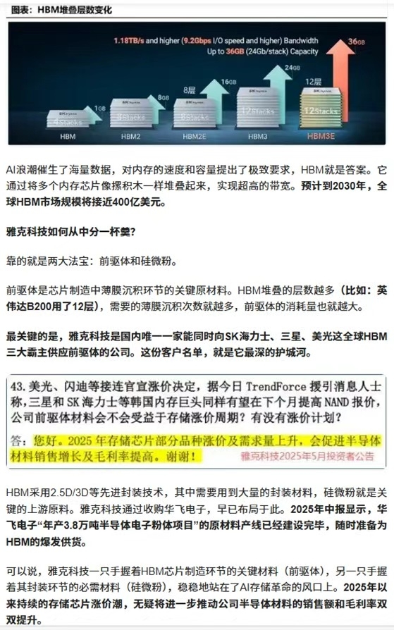 【与华为】:雅克科技与华为在HBM4用前驱体材料方面开展联合开发,旨在满足高端AI芯片对高性能存储的需求;此外,华为作为重要客户,间接通过SK海力士的供应链受益于雅克科技的技术支持。