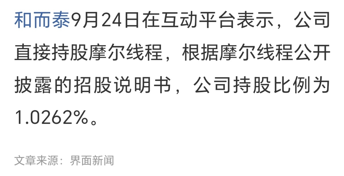 摩尔线程估值2500亿(取中值),和而泰持股1.0262%,约合25.655亿,目前和而泰市值530亿。