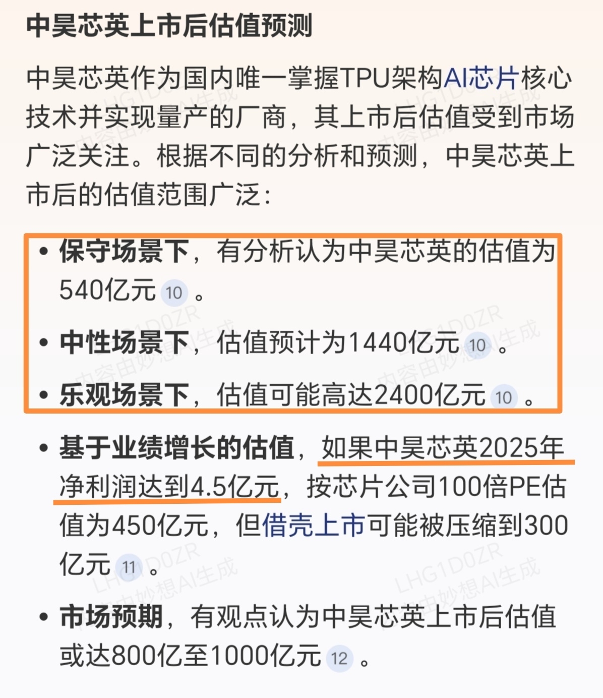 中昊芯英估值1440亿(取中值),科德教育持股5.53%,约合76.32亿,目前科德教育市值64亿。