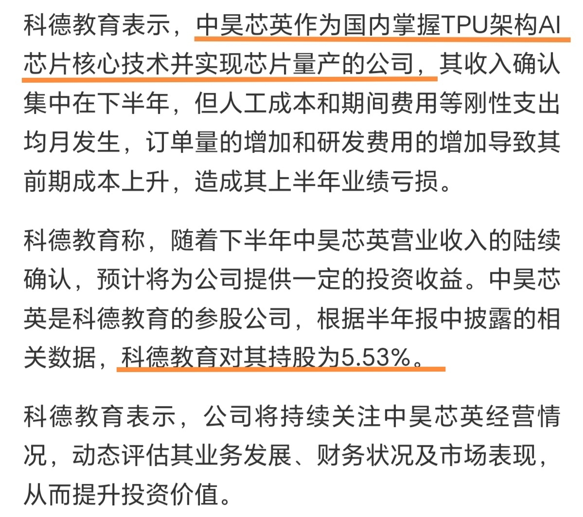 科德教育持有中昊芯英的权益是和而泰持有摩尔线程的权益的3倍多,但是和而泰市值却是科德教育市值的8倍多,二者估值被扭曲了整整24倍多。