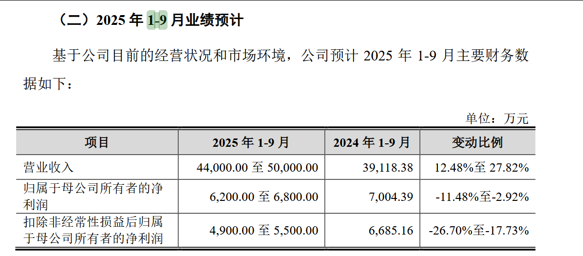 《科创板日报》记者注意到,招股书显示,2025年前三季度恒坤新材预计营业收入4.4亿元至5亿元,同比增长12.48%-27.82%,归母净利润预计为6200万元至6800万元,同比减少11.48%-2.92%,主要是受部分引进产品合作终止的影响,引进业务毛利有所下降。