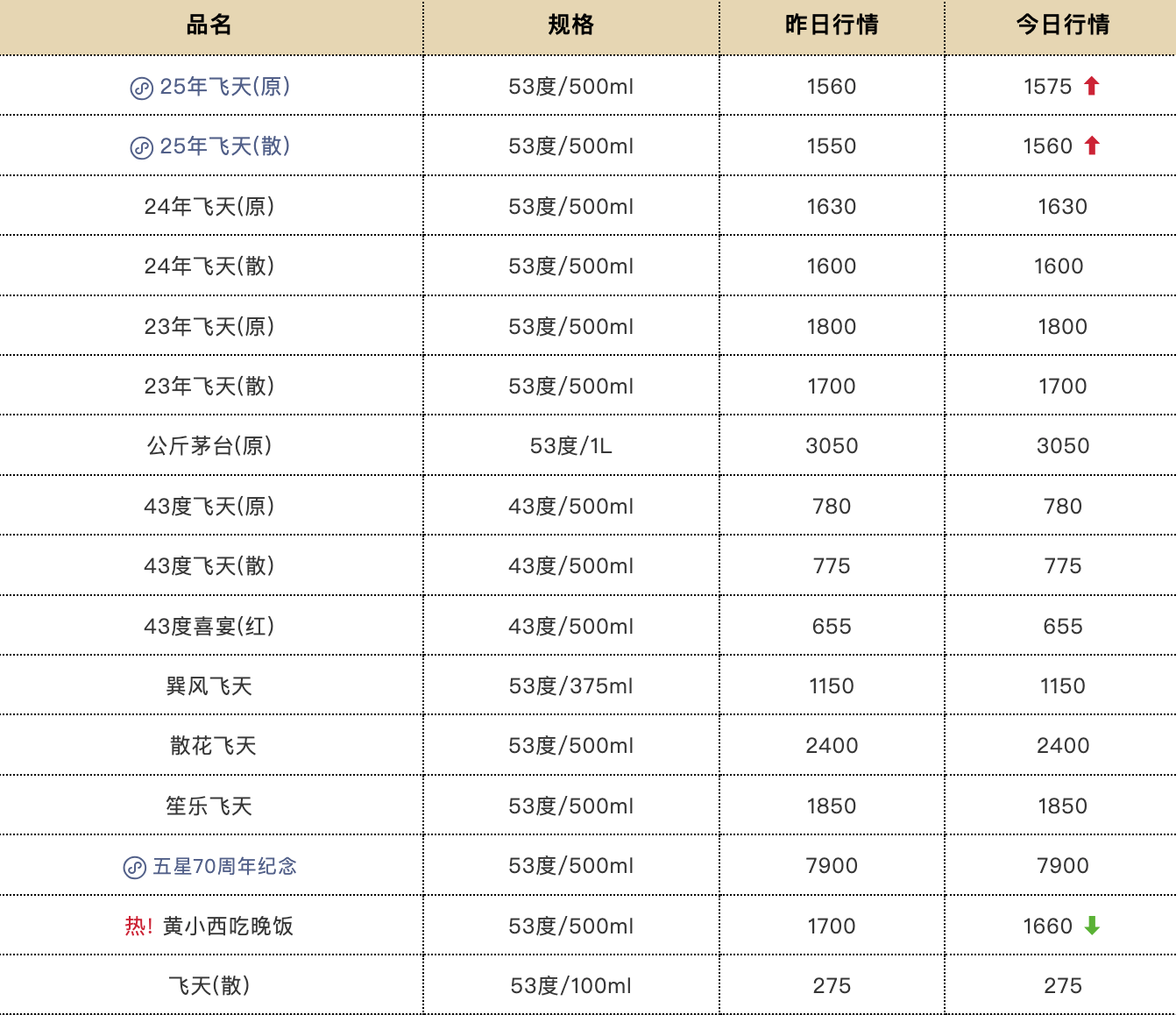 “今日酒价”披露的最新批发参考价显示,12月29日,25年飞天茅台原箱报1575元/瓶,较上一日涨15元;25年飞天茅台散瓶报1560元/瓶,较上一日涨10元。