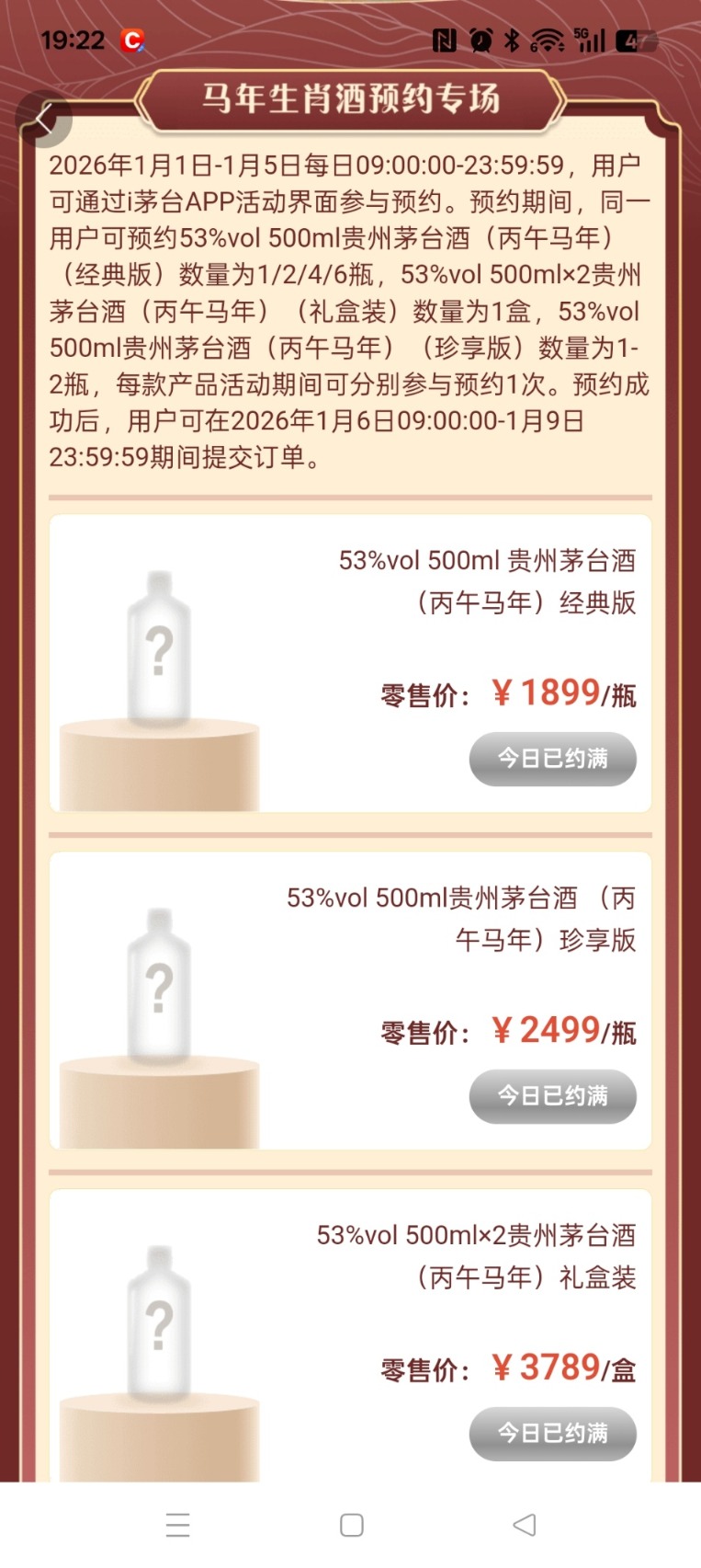 据悉,上述产品已于2026年1月1日至1月5日期间,在i茅台App开启预售。其中,53%vol 500ml贵州茅台酒(丙午马年)经典版、礼盒装和珍享版三款产品预售价格依次为1899元/瓶、2499元/瓶、3789元/瓶。