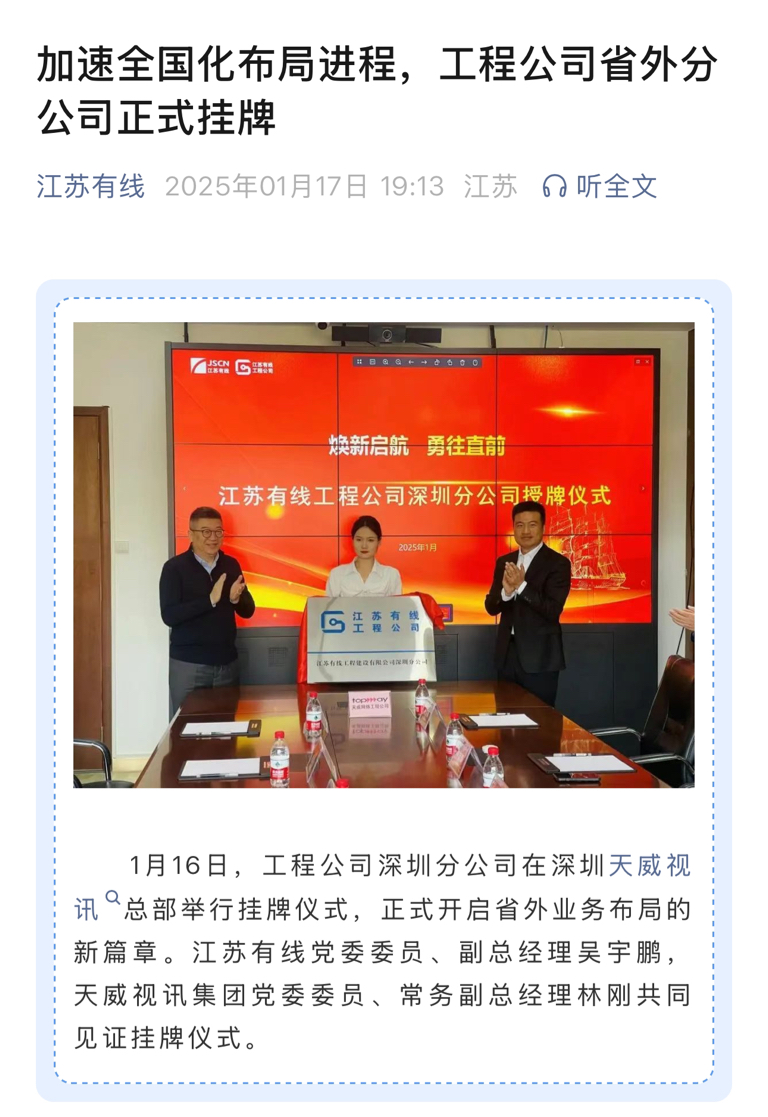 今日,江苏有线同时在深圳“天威视讯”和北京“歌华有线”挂牌成立省外分公司,这是什