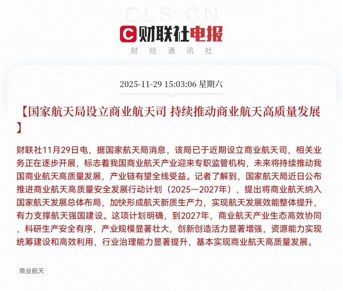 据国家航天局消息,该局已于近期设立商业航天司,推进商业航天高质量安全发展行动计划(2025—2027年)。加快形成航天新质生产力,实现航天发展效能整体提升,有力支撑航天强国建设。