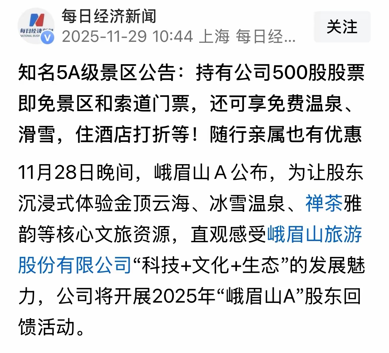 峨眉山A,为让股东沉浸式体验金顶云海、冰雪温泉、禅茶雅韵等核心文旅资源,直观感受峨眉山旅游股份有限公司“科技+文化+生态”的发展魅力,公司将开展2025年“峨眉山A”股东回馈活动。