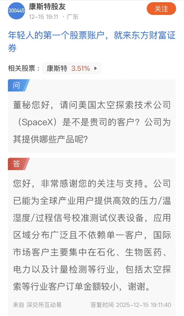 $商业航天(BK0963)$ 太空探索公司连续九年的供应商,全市场唯一承认的公司,靠不靠谱!$康斯特(SZ300445)$ $佳缘科技(SZ301117)$