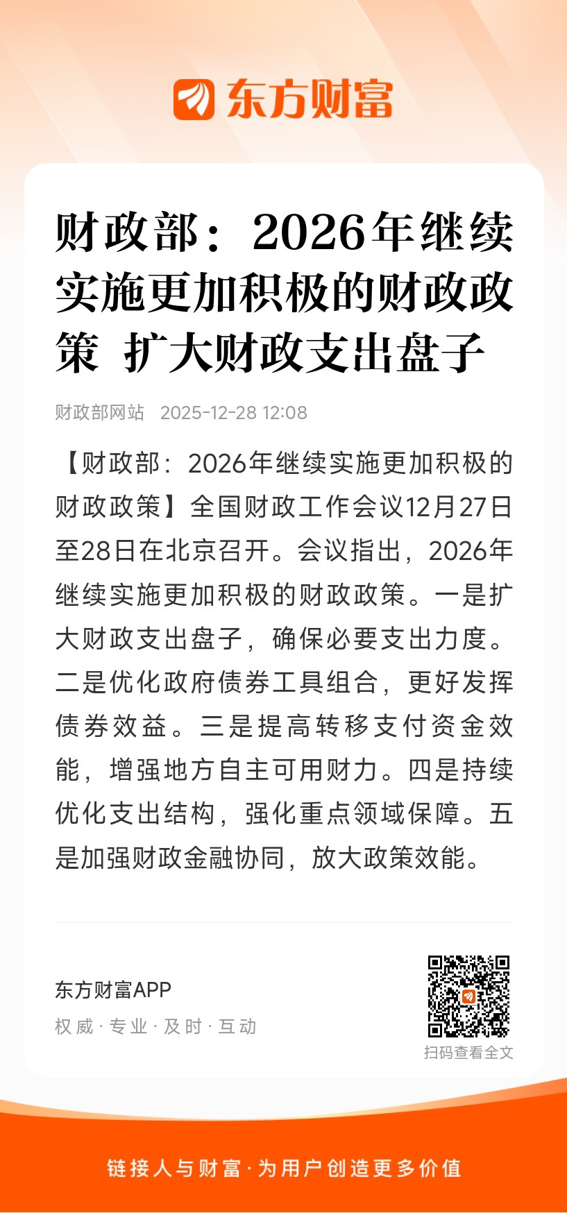 $商业航天(BK0963)$ $地产指数(SH000006)$ $*ST南置(SZ002305)$ 政策刺激再次加码,2026年实施更加积极的财政政策刺激经济。这周的连涨几天的航天板块,迎来重大利空,注意航天板块出来的资金,可能去向低位补涨的板块,留意相关个股的补涨机会。重点是地产消费板块……跨年行情开启……