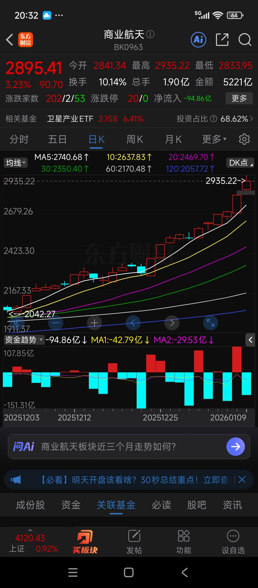 $商业航天(BK0963)$ 我来发两张图片,一张是东方财富,一张是指南针。请大家帮我分析分析。