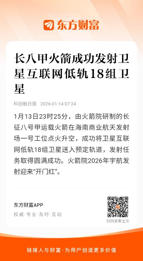 1月13日23时25分,由火箭院研制的长征八号甲运载火箭在海南商业航天发射场一号工位点火升空,成功将卫星互联网低轨18组卫星送入预定轨道,发射任务取得圆满成功。火箭院2026年宇航发射迎来“开门红”。