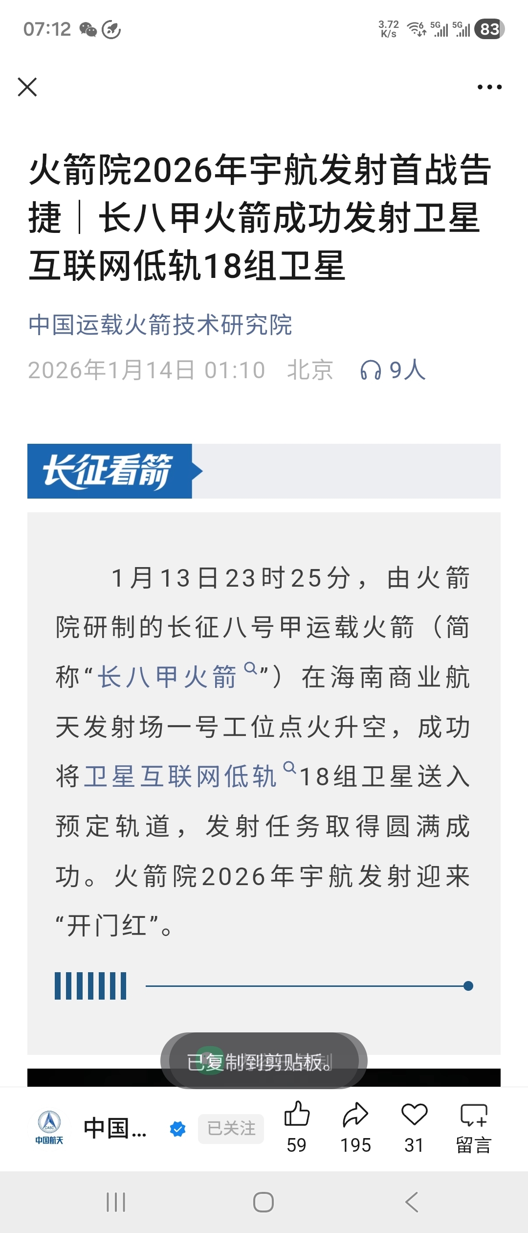 $商业航天(BK0963)$ 1月13日23时25分,由火箭院研制的长征八号甲运载火箭(简称“长八甲火箭”)在海南商业航天发射场一号工位点火升空,成功将卫星互联网低轨18组卫星送入预定轨道,发射任务取得圆满成功。火箭院2026年宇航发射迎来“开门红”。#商业航天大幅调整,止盈信号还是倒车接人?#