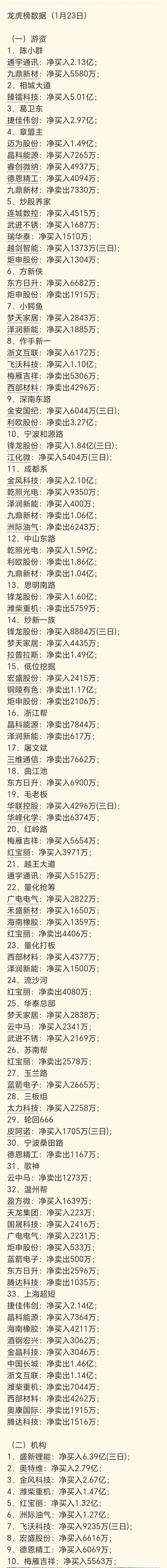 1月23日A股龙虎榜揭示,游资阵营呈现显著分化态势,核心资金围绕科技、新能源两大主线展开高强度博弈,市场分歧进一步加剧。