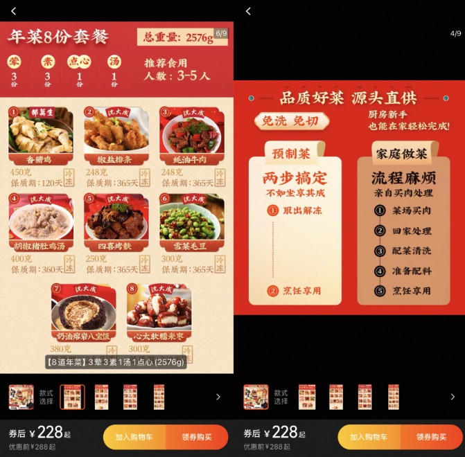淘宝上,沈大成的年夜饭预制菜礼盒8道菜仅需228元,16道菜668元。新雅的佛跳墙预制菜礼盒10道菜仅需356元,主页显示销量已超过3000单。京东上,全聚德等品牌的年夜饭预制菜礼盒显示已售2000单。