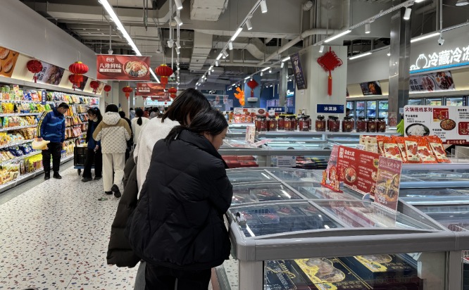 线下商超主打“即买即食”的便捷体验,蓝鲸记者发现,年夜饭预制菜专区,挤满了前来选购的消费者,不少年轻人推着购物车,穿梭在货架间,和家人讨论着年夜饭菜单。工作人员也表示,近期这类菜品销量很好。
