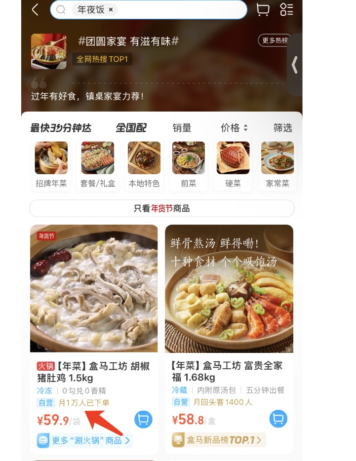 线上方面,年夜饭预制菜同样火爆。盒马app上,胡椒猪肚鸡月销量超过万单,富贵全家福月回头客1400人。