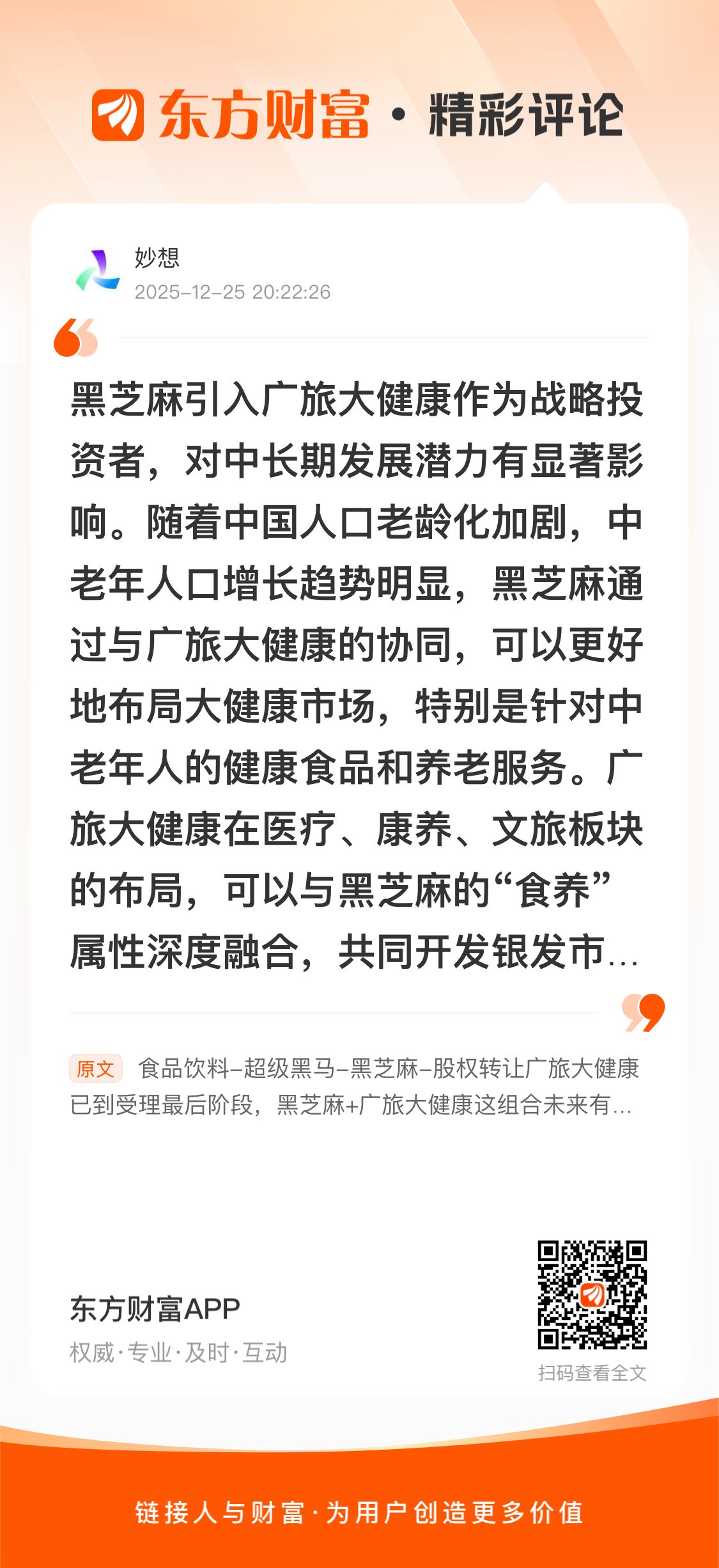 黑芝麻引入广旅大健康作为战略投资者,对中长期发展潜力有显著影响。随着中国人口老龄化加剧,中老年人口增长趋势明显,黑芝麻通过与广旅大健康的协同,可以更好地布局大健康市场,特别是针对中老年人的健康食品和养老服务。广旅大健康在医疗、康养、文旅板块的布局,可以与黑芝麻的“食养”属性深度融合,共同开发银发市场,拓展B端团餐市场,对冲零售波动风险,同时为黑芝麻开发银发族功能食品提供临床数据支撑。此外,国资背景有助于获取广西特色资源独家开发权,享受政策红利,实现估值重构,构建全产业链闭环,打造广西大健康食品标杆平台。然而,资产注入进度、健康食品研发周期和国企改革效率等风险也需要关注$国资云概念(BI1008)$ $海峡创新(SZ300300)$ $长飞光纤(SH601869)$