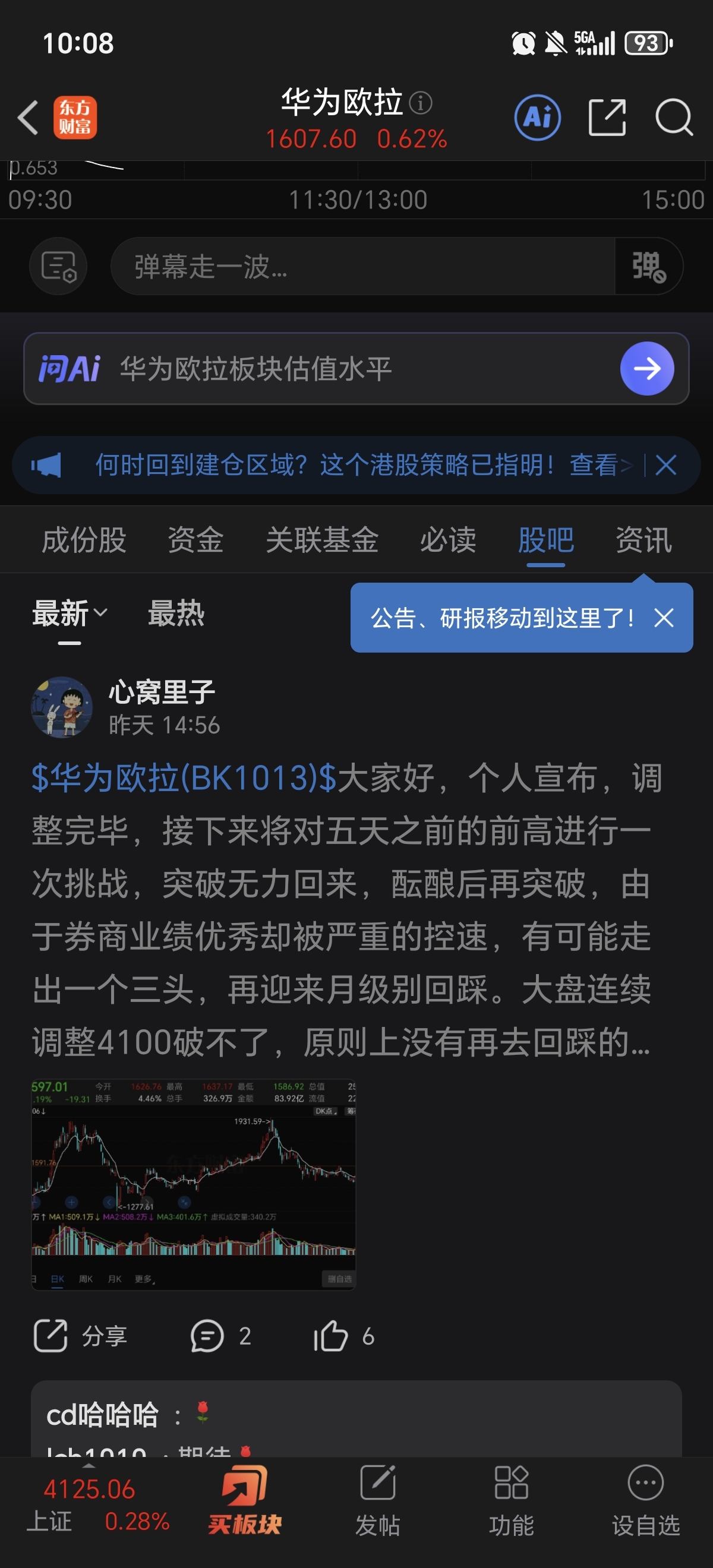 $华为欧拉(BK1013)$ 大家好,昨日研判基本得到验证,昨日利用外围戴维斯三基,也没有破掉4100,指数只好向着阻力最小方向前进,当然目前不能说十拿九稳,但大差不大,今天是空投最后靓机,不能砸破4100,大盘将进入持续小阳拉升,因为控节奏,无法大阳,高位股依然会被资金自我调控,不能过于异动,好机会依然在低位启动方向。
