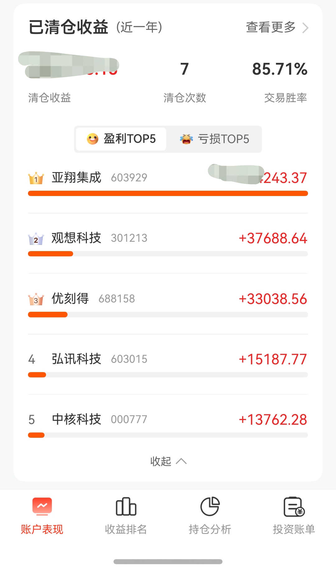 不过换个角度想,盈利兑现的票还能继续大涨,恰恰说明通过深度研究公司和行业选出来的标的都不差。我的组合里几十只票,只有两只是微亏状态,其余全部盈利,好几只更是做到了负成本!近一年止盈的7只票里,6只都是盈利离场,只有1个票小亏几千块,这个胜率自己还是很满意的。如果不是急需用钱,那只票再拿一个月也是盈利的,我是8元左右兑现的,现在股价已经冲到12元了。