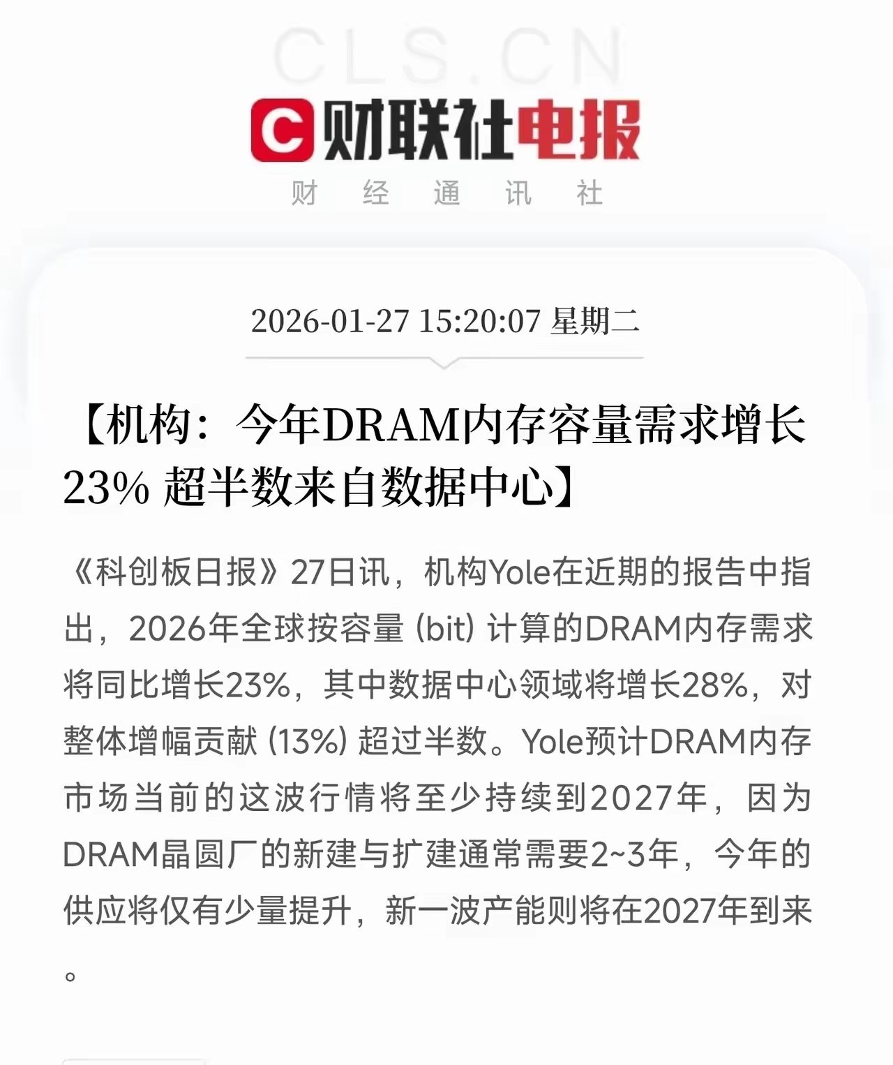 半导体芯片,盘后又有利好。机构Yole在报告中说,今年DRAM内存容量需求增长23%,数据中心增长28%。还说行情,将持续到2027年。这无疑就是对半导体芯片,又是利好。