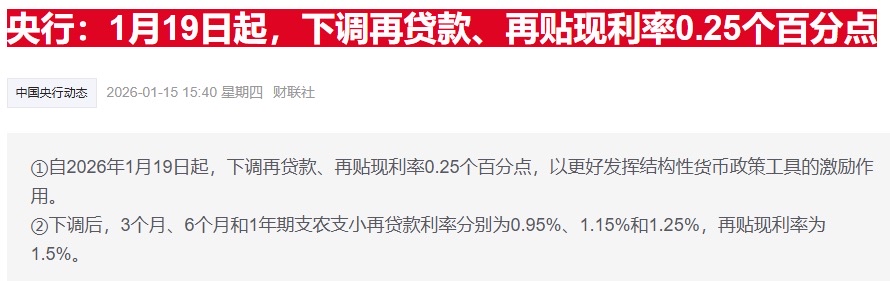 2026年1月15日A股盘后,ZG央行宣布了新一轮结构性货币政策工具调整,核心内容包括:自1月19日起,下调再贷款、再贴现利率0.25个百分点;增加支农支小再贷款及科技创新再贷款额度。此举选择在沪指连续三日回调、市场情绪趋于谨慎的时刻出台,其影响是多维且深远的。