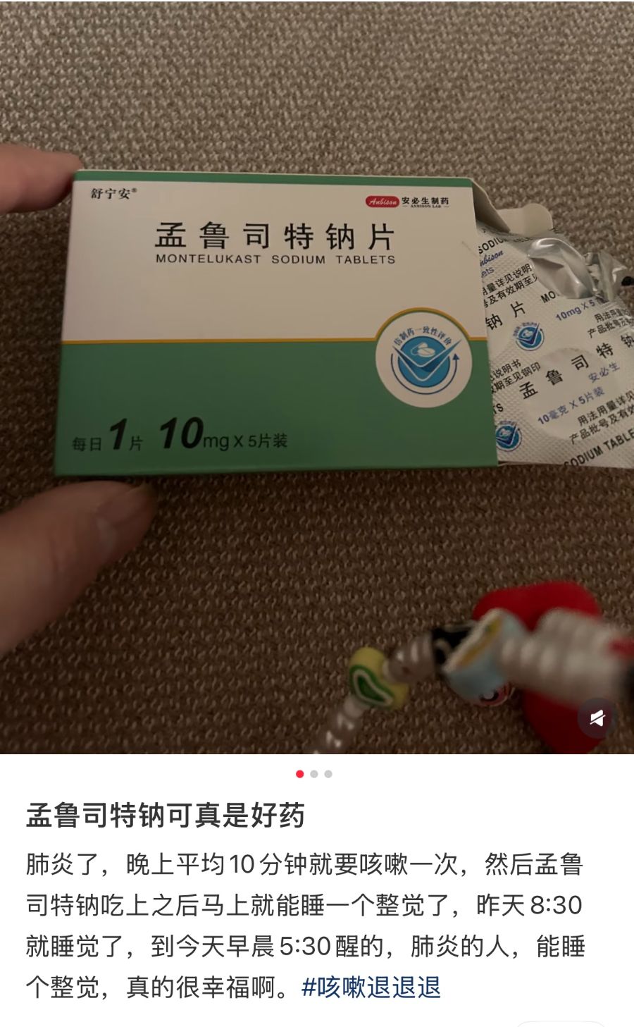 这也意味着孟鲁司特超适应症使用现象较为普遍。21世纪经济报道记者在社交平台发现,不少用户分享用药经历,例如“肺炎了,晚上平均十分钟咳嗽一次,孟鲁司特纳吃上之后马上就能睡一个整觉了”。