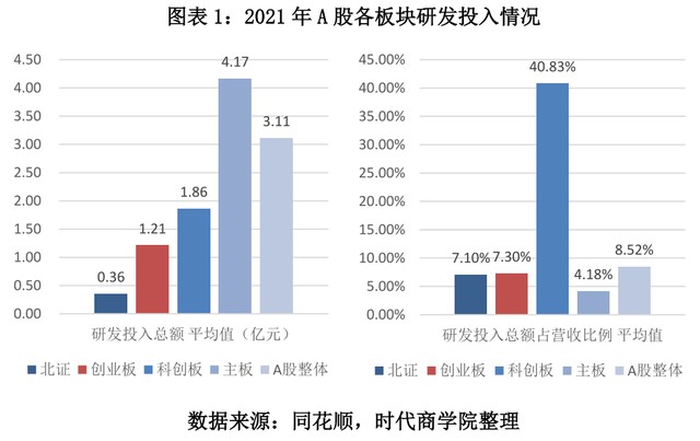 从研发投入占比来看,2021年,创业板企业研发投入占营收的比例平均值为7.3%,而A股企业平均值为8.52%。
