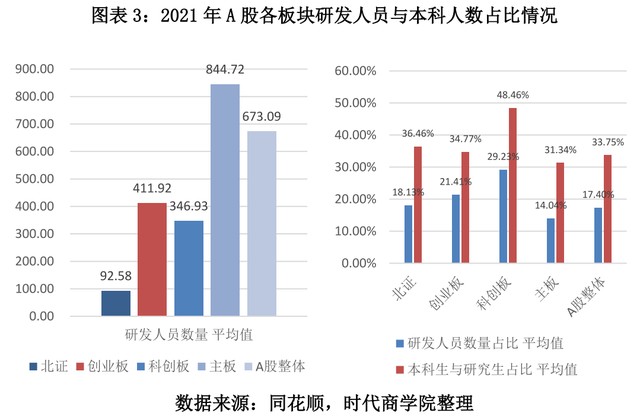 图表3:2021年A股各板块研发人员与本科人数占比情况