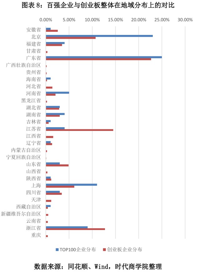 图表8:百强企业与创业板整体在地域分布上的对比