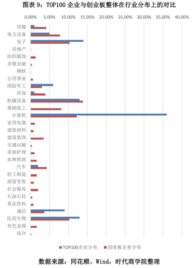 图表9:TOP100企业与创业板整体在行业分布上的对比
