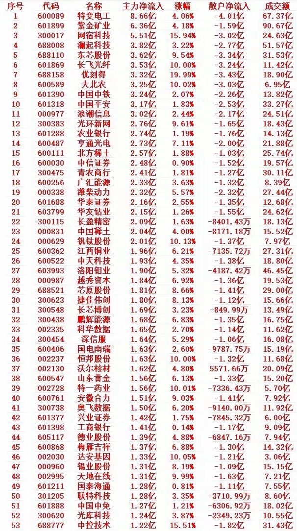 证券(中信证券、华泰证券、兴业证券)、银行(农业银行、工商银行、青农商行)、有色/黄金(紫金矿业、北方稀土、山东黄金、江西铜业)等板块标的均进入主力净流入榜单。这类标的主力净流入规模虽未居前,但均实现稳步上涨,且散户资金持续流出,体现主力对低估值、高股息板块的中长期布局意愿,成为市场资金的“安全垫”。