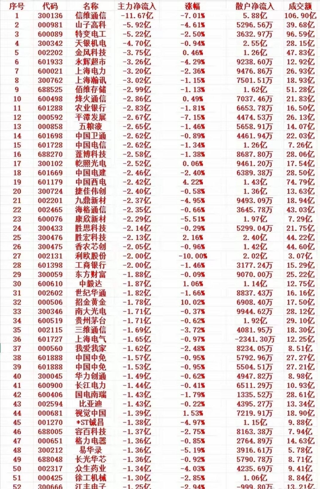 序号 代码 名称 主力净流出 股价变动 散户净流入 成交额