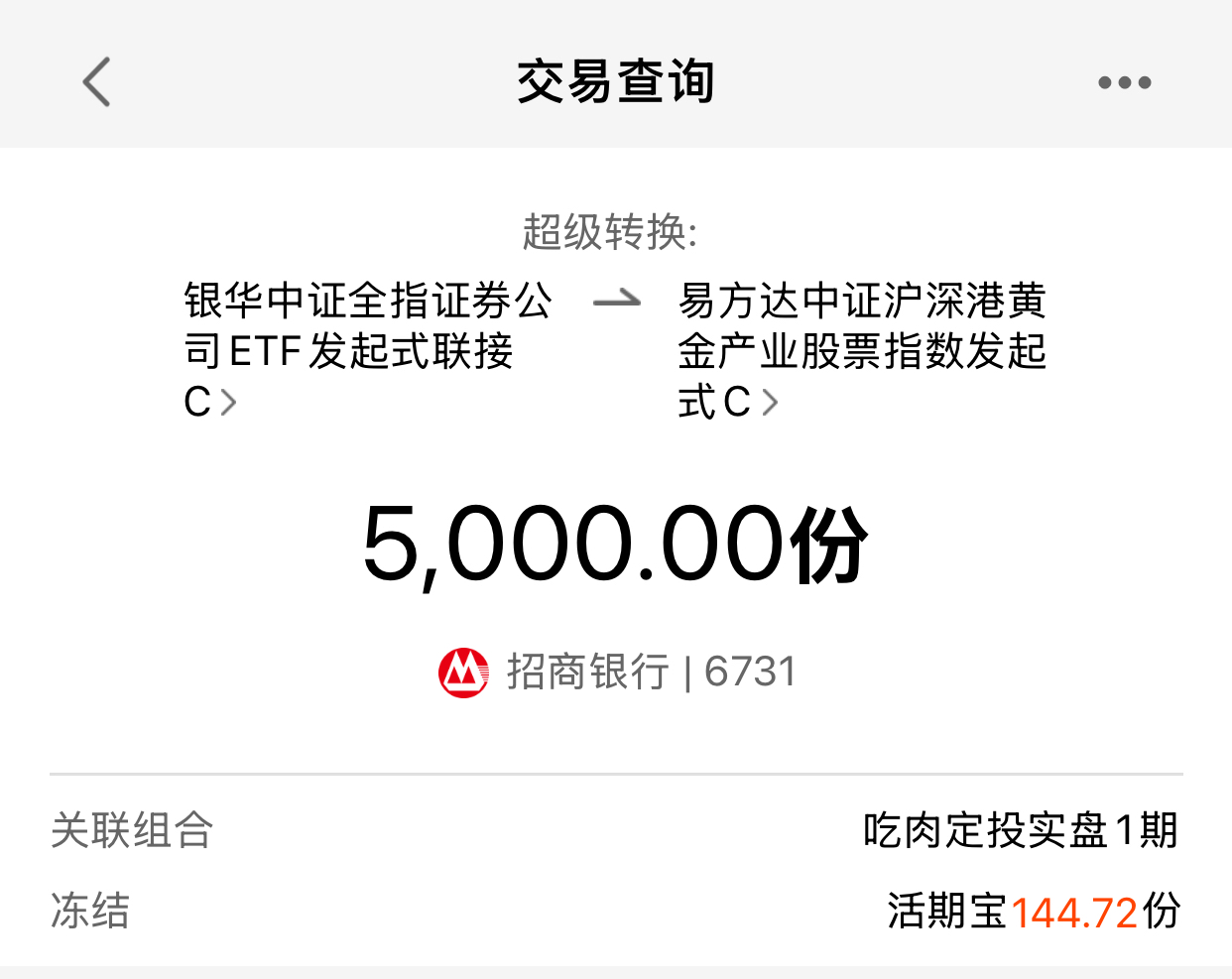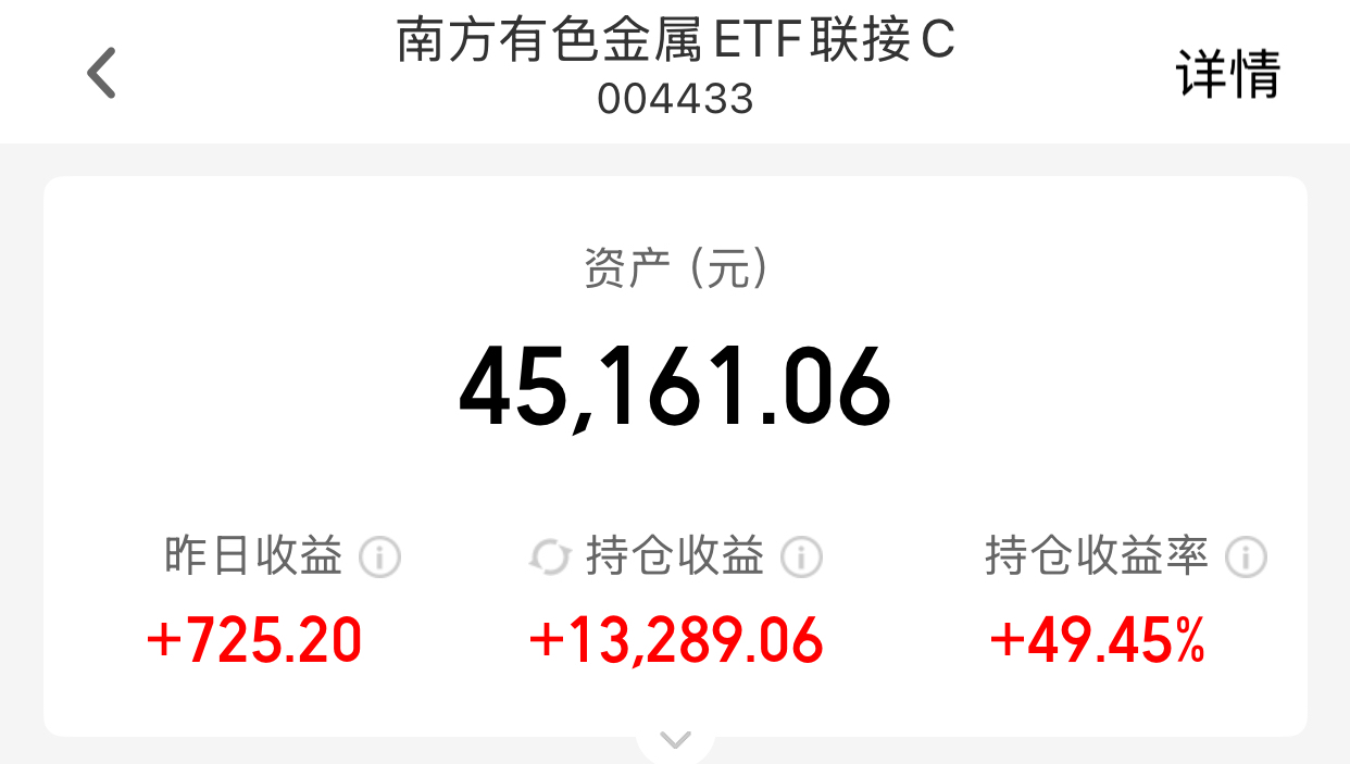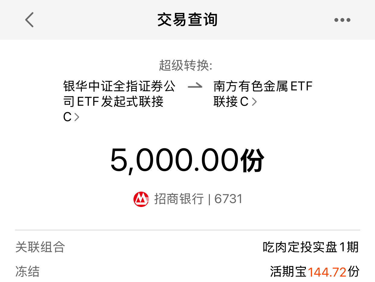今日买入5000元南方有色金属(004433),昨天加的那一笔短期看被挂在山顶了,长期看只是半山腰,今天倒车接人,我再加一笔,因为没有现金,我从证券基金转一笔进去。有色我还是看好的,短期是情绪资金面主导,长期看业绩,今年业绩都要爆炸,供给侧的约束不是一两天能改变的,这才是大逻辑,各国也不会因为这种波动就不储备黄金了,央行买黄金是只买不卖,类似股票注销回顾,金价还会涨,就这么简单,所以毫无疑问加仓。