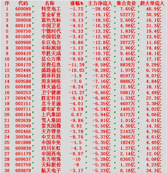 2. 紫金矿业:主力资金净流出19.1亿元,超大单流入30.9亿元,资源类标的遭主力抛售,同时获超大单资金部分布局;
